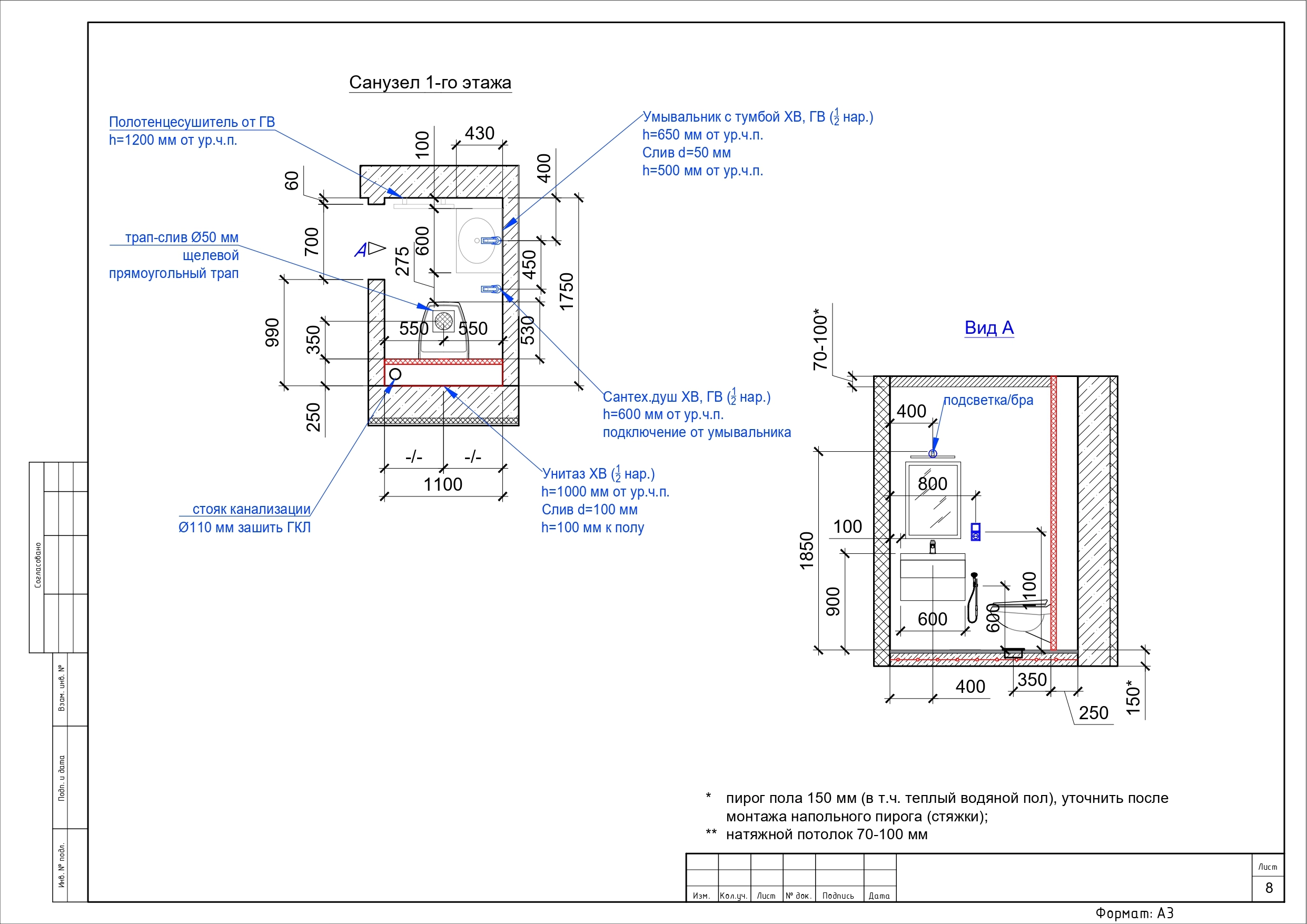 Пирог пола 150 мм (в т.ч. теплый водяной пол), уточнить после монтажа напольного пирога (стяжки);